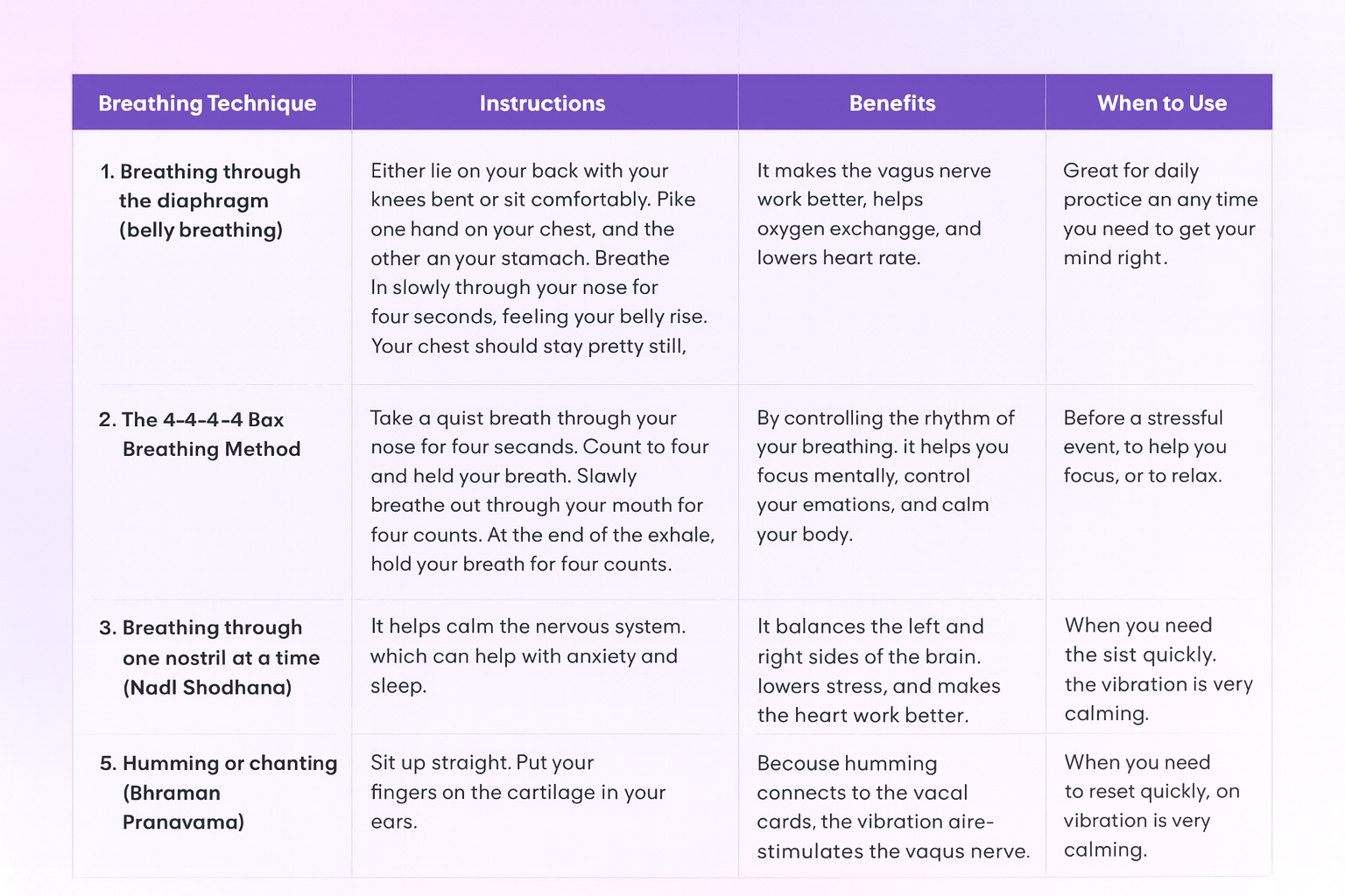 - Timing: Base your practice on things you already do. Try your vagus nerve breathing for two minutes when you wake up, before you check your phone, or during a break at work. Before bed, practicing these breathing exercises for vagus nerve can make a big difference in how well you sleep.