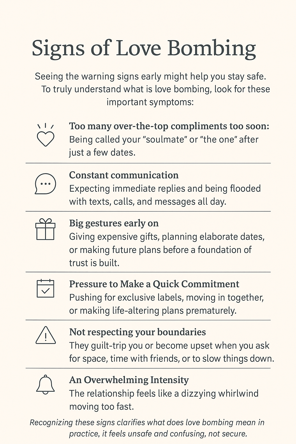 If you recognize these indications, it's crucial to understand what is love bombing so you can take proactive steps: